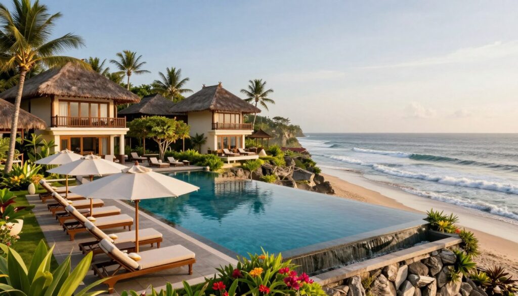 The resort blends traditional Balinese design with modern tech and comforts. This creates a unique atmosphere that’s both culturally rich and modern.